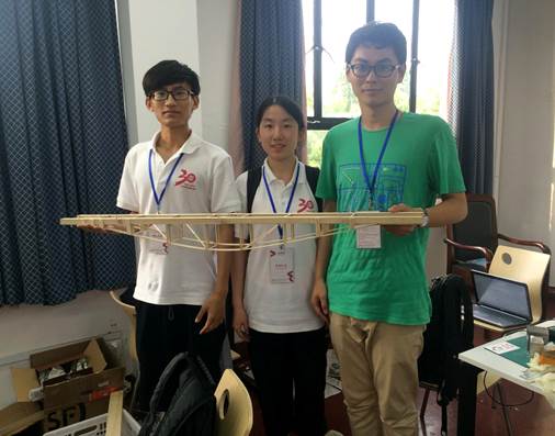 本次竞赛以“承受振动荷载的桥梁模型设计与制作”为题,参赛队伍需在20小时制作时间内,以木材手工制作一座能够承受振动荷载的桥梁模型。为了满足低桥面和高跨度的双重目的,我校代表队以海浪创意来源,利用力在主梁、竖杆和拉条间的传递,使梁形成张弦梁结构,增强模型的抗弯能力。考虑到荷载的不对称性,队员们在荷载大的一侧设置了五跨,另一侧设置了四跨,使桥形成不对称结构,节省材料的同时提高了材料的使用效率。最终,代表队凭借轻盈的模型质量和优异的模型效率获得优胜奖。